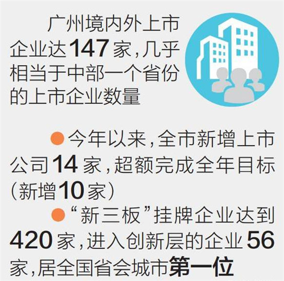 截至目前,廣州擁有境內(nèi)外上市企業(yè)達(dá)147家,這一數(shù)量幾乎相當(dāng)于中部一個(gè)省份的上市企業(yè)數(shù)量。今年以來(lái),全市新增上市公司14家,超額完成全年目標(biāo)(新增10家)。“新三板”掛牌企業(yè)達(dá)到420家,進(jìn)入創(chuàng)新層的企業(yè)56家,居全國(guó)省會(huì)城市第一位。