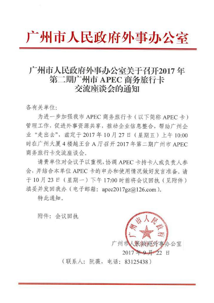 廣州市人民政府外事辦公室關(guān)于召開2017年第二期廣州市APEC商務(wù)旅行卡交流座談會的通知