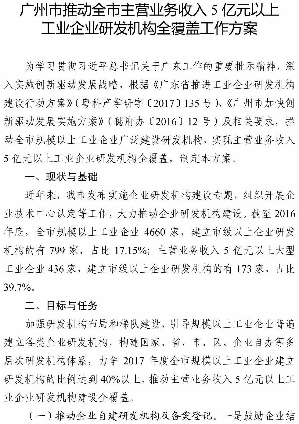 關(guān)于印發(fā)《廣州市推動全市主營業(yè)務(wù)收入5億元以上工業(yè)企業(yè)研發(fā)機構(gòu)全覆蓋工作方案》的通知