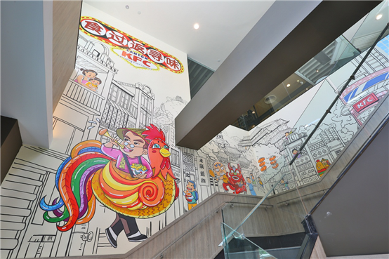 巨幅的廣府大道主題手繪墻、絢麗的民俗文化巡游墻、延綿的鑊耳屋嵌著吉祥的中式回紋、融合非遺技藝的四季花剪紙、孩子們創(chuàng)作的通草畫裝飾……餐廳融入廣府文化的建筑風(fēng)格與廣府廟會場景完美融合,在這里以街頭表演的形式上演“廣味的喜劇”,別有一番情趣。
