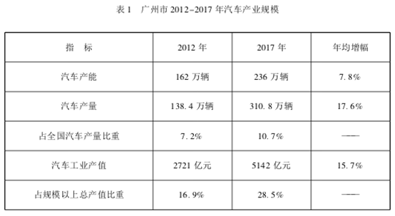 廣州汽車產(chǎn)量從2012年的138.4萬輛提升至2017年的310.8萬輛,年均復(fù)合增速17.6%,高于全國平均水平5.9%。占全國汽車產(chǎn)量的比重由2012年的7.2%,提升至2017年的10.7%。2017年廣州整車產(chǎn)量規(guī)模在國內(nèi)特大汽車城市中排名第一,廣州汽車制造業(yè)工業(yè)總產(chǎn)值達(dá)5142億元,占廣州市規(guī)模以上工業(yè)總產(chǎn)值的28.5%,同比增長17.4%,其中零部件制造業(yè)產(chǎn)值達(dá)1364億元,同比增長14.4%。