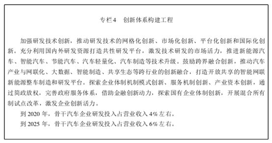 加大資源要素投入力度,統(tǒng)籌規(guī)劃,合理布局,建立以中國品牌汽車為主體,關(guān)鍵零部件、工藝工程裝備、試驗檢測和后市場服務(wù)為支撐的現(xiàn)代汽車工業(yè)體系,明確重點發(fā)展方向,全面提升創(chuàng)新能力,積極發(fā)展智能網(wǎng)聯(lián)新能源汽車,加快重點領(lǐng)域和關(guān)鍵環(huán)節(jié)突破發(fā)展。