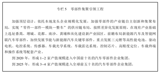 前瞻布局新能源汽車及智能網(wǎng)聯(lián)汽車零部件,加快發(fā)展節(jié)能與新能源汽車關(guān)鍵零部件。重點發(fā)展三元鋰等高性能電池、驅(qū)動電機(jī)、電控系統(tǒng)、傳感器、車載光學(xué)系統(tǒng)、車載雷達(dá)系統(tǒng)、控制芯片、高精度定位、車載終端和操作系統(tǒng)等配套產(chǎn)業(yè)。
