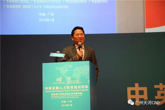 為深入學習貫徹廣東省委十二屆四次全會精神,踐行“四個走在全國前列”,深刻領會全會提出的“以粵港澳大灣區(qū)建設為重點,加快形成全面開放新格局”的工作要求,使廣州地區(qū)金融高管認清粵港澳大灣區(qū)金融合作中面臨的機遇和挑戰(zhàn),有效擴大粵港澳金融合作領域,推進大灣區(qū)金融發(fā)展,7月13日,由廣州市天河中央商務區(qū)管委會和英國國際貿易部聯(lián)合主辦,廣州市總部經(jīng)濟協(xié)會支持的“中英金融人才教育培訓——粵港澳大灣區(qū)金融合作發(fā)展專題”在廣州珠江城國際會議中心舉行。