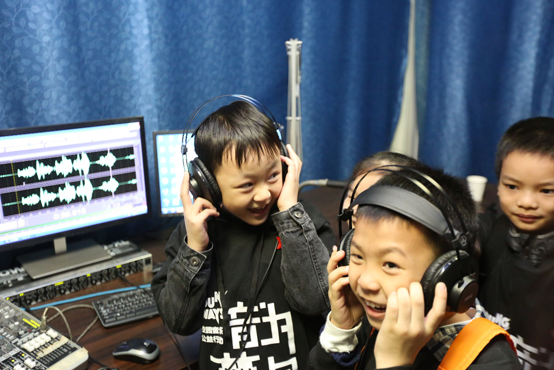 (孩子們第一次體驗電臺節(jié)目錄制”)