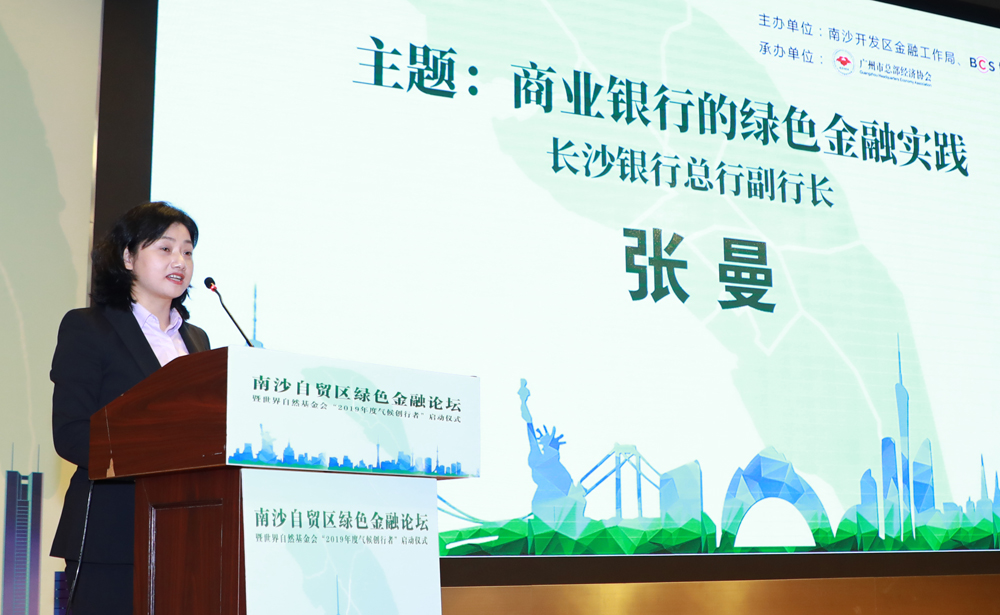 在這次會議上,今后會更加踐行綠色金融+綠色科技模式來服務綠色產業(yè)和廣州鞏固經濟的發(fā)展,這次我們與廣州市總部經濟協(xié)會與綠融(北京)投資服務有限公司簽署100億元的戰(zhàn)略合作協(xié)議;與世界自然基金會、廣州市總部經濟協(xié)會、綠融(北京)投資服務有限公司簽署20億元的“2019年度氣候創(chuàng)行者”項目戰(zhàn)略合作協(xié)議。這些戰(zhàn)略合作協(xié)議的簽署是寫在史上的東西,更重要的是落實到行動上,廣州分行將在三個方面來落實合作舉措,一是要對廣州綠色金融中心服務給予100億元的綠色授信資金,對于氣候創(chuàng)行者項目給予20億綠色授信支持,二是為非盈企業(yè)提供人資顧問和財資顧問,一對一產品的設計和創(chuàng)新,債券及其他金融工具的應用,在投資上,我們會優(yōu)先提供新金融服務產品,為綠色金融企業(yè)和綠色項目提供服務。三是建立三級人員專業(yè)化服務團隊,為項目和企業(yè)做好服務,廣州分行在南沙區(qū)設立了支行,未來南沙區(qū)支行會更加為綠色項目和綠色企業(yè)來做好相應的服務。同時長沙銀行也期待我們相應各個領域的專家,各位企業(yè)能給我們提供更加寶貴的意見,我想你們的意見和建議是我們今后努力的方向,我們也期待通過與廣州市總部經濟協(xié)會和世界自然基金會,提供新的舉措,一起創(chuàng)造出服務綠色企業(yè)的新模式。再次感謝今天會議主辦方提供這么好的機會和平臺,讓長沙銀行能夠參與進來,后續(xù)我們會把相應的工作做實做好做優(yōu)。