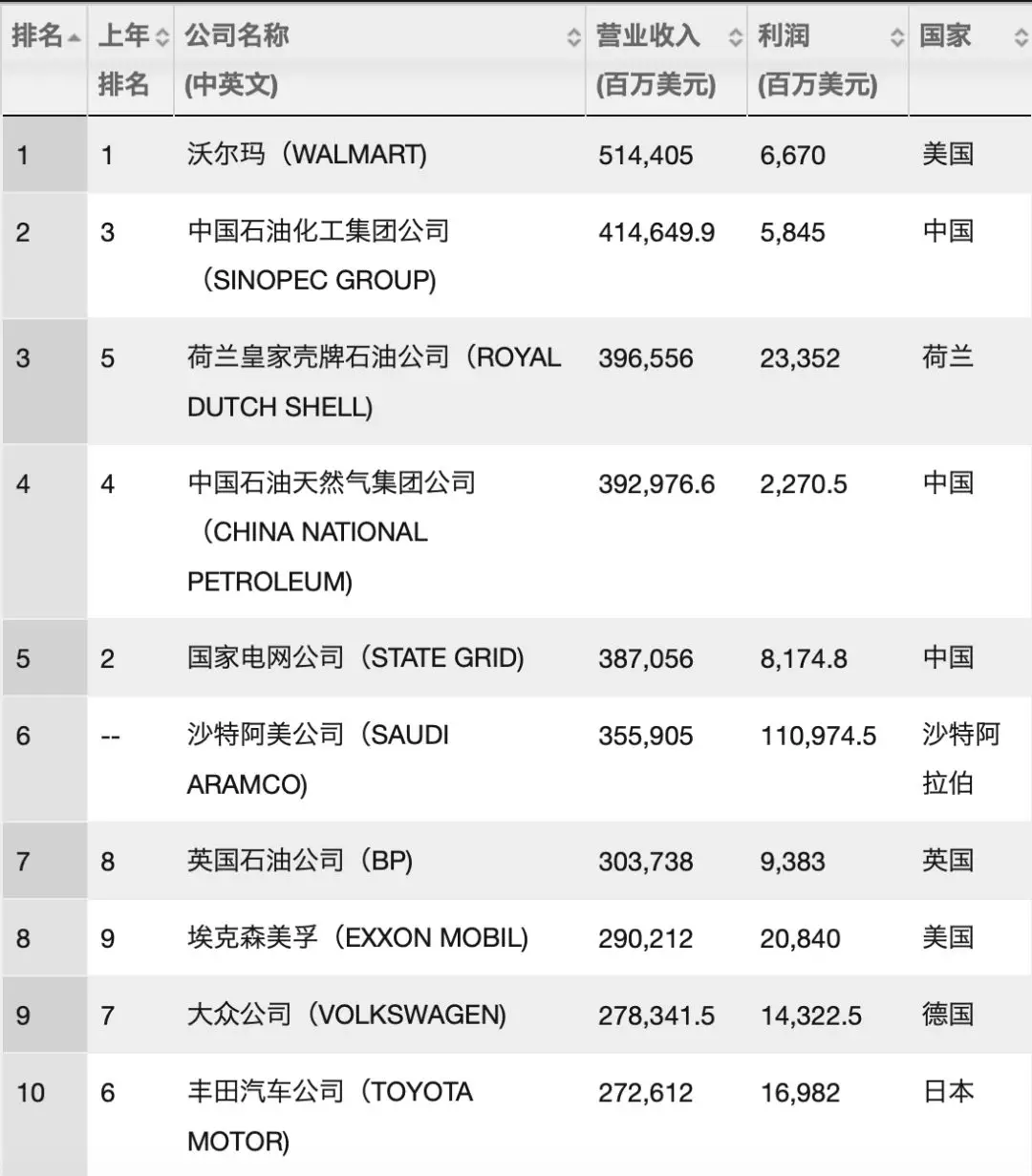 沃爾瑪連續(xù)第六年成為全球最大公司,中國石化位列第二,殼牌石油上升至第三位,中國石油和國家電網(wǎng)分列第四、第五位,新上榜的巨型石油公司沙特阿美則位居第六位。