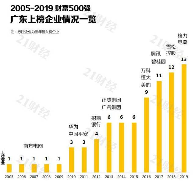從1996年到2019年,過去24年中,中國從當初的兩家企業(yè)入圍,到如今領(lǐng)跑全球。作為中國經(jīng)濟第一大省的廣東,伴隨著經(jīng)濟總量的不斷提升,總部位于廣東的世界500強企業(yè)數(shù)量也從2005年僅有1家,到如今擁有13家,并且排名不斷向前。