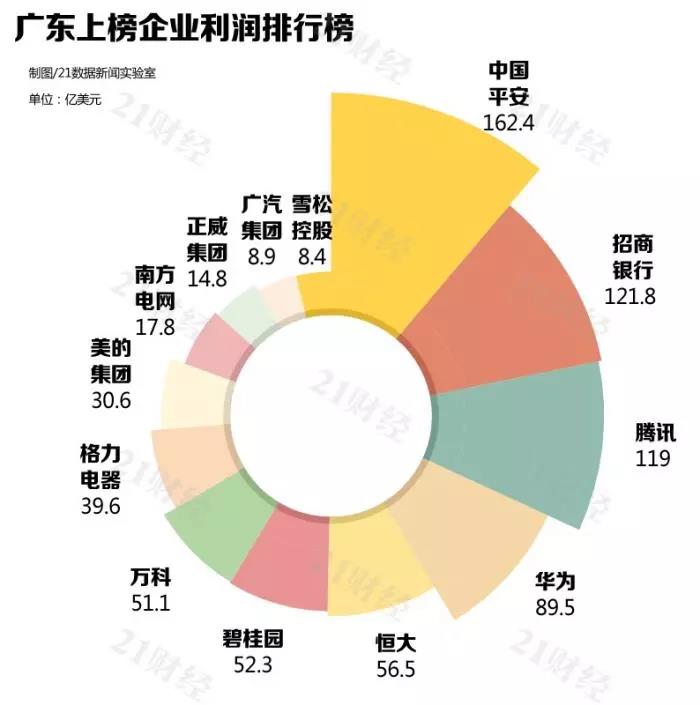 在54家利潤超過百億美元的世界500強公司中,12家來自中國公司,廣東占了3家,分別是中國平安、招商銀行、騰訊。