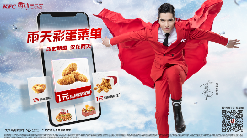 以此次榮獲全場(chǎng)大獎(jiǎng)的肯德基“KFC雨神宅急送”創(chuàng)意營(yíng)銷為例,從5月17日持續(xù)至8月16日,全國(guó)超過(guò)1,100個(gè)城市的4,000家肯德基宅急送餐廳都參與其中。通過(guò)與知名天氣類服務(wù)平臺(tái)——墨跡天氣攜手,成功挖掘和激發(fā)用戶需求實(shí)現(xiàn)轉(zhuǎn)化,為用戶提供了更多生活化和場(chǎng)景化的服務(wù),實(shí)現(xiàn)了“天氣+飲食”的營(yíng)銷突破。