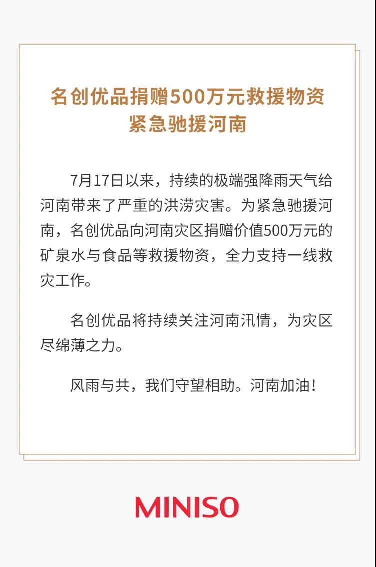名創(chuàng)優(yōu)品捐贈(zèng)500萬(wàn)元救援物資,緊急馳援河南!